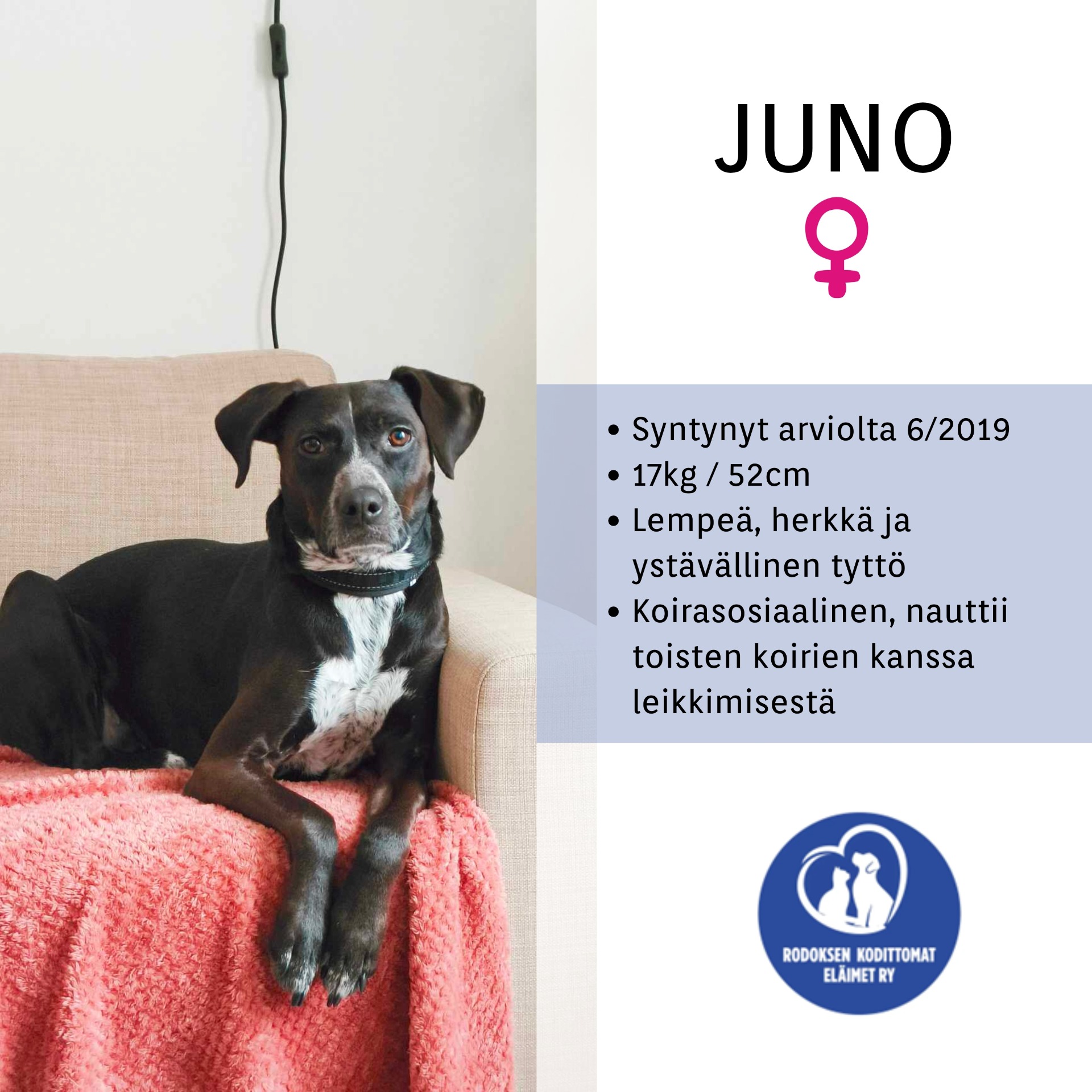 Junolle etsitään kotia rauhallisesta ympäristöstä, jossa hänelle voidaan tarjota rauhallinen, ymmärtäväinen ja turvallinen ympäristö sekä aikaa sopeutua. Juno hyötyy rutiineista ja lempeästä ohjauksesta. Junolle hyvä asuinympäristö voisi olla rauhallisella alueella sijaitsevassa omakoti- tai rivitalossa. Juno sopisi arviomme mukaan hyvin myös kotiin, jossa olisi koirakaveri jo odottamassa.