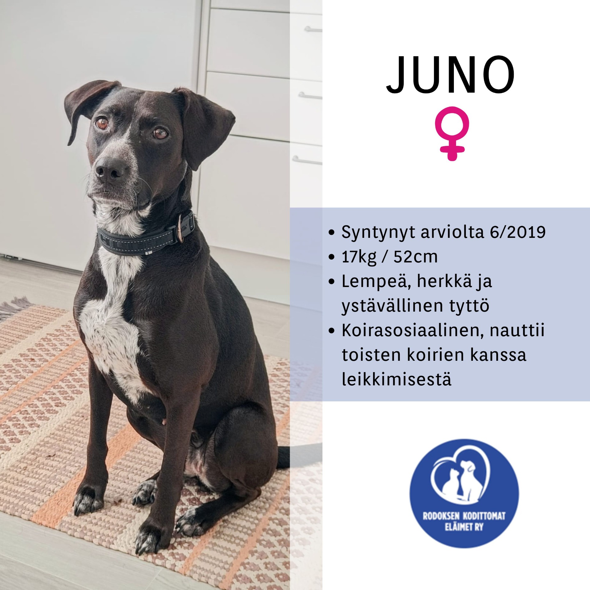 Juno on ihastuttava, noin 6-vuotias tyttökoira, joka saapui Rodokselta Suomeen lokakuussa 2023. Omistajien muuttuneen elämäntilanteen vuoksi Junolle etsitään uutta, rauhallista ja pysyvää kotia.
