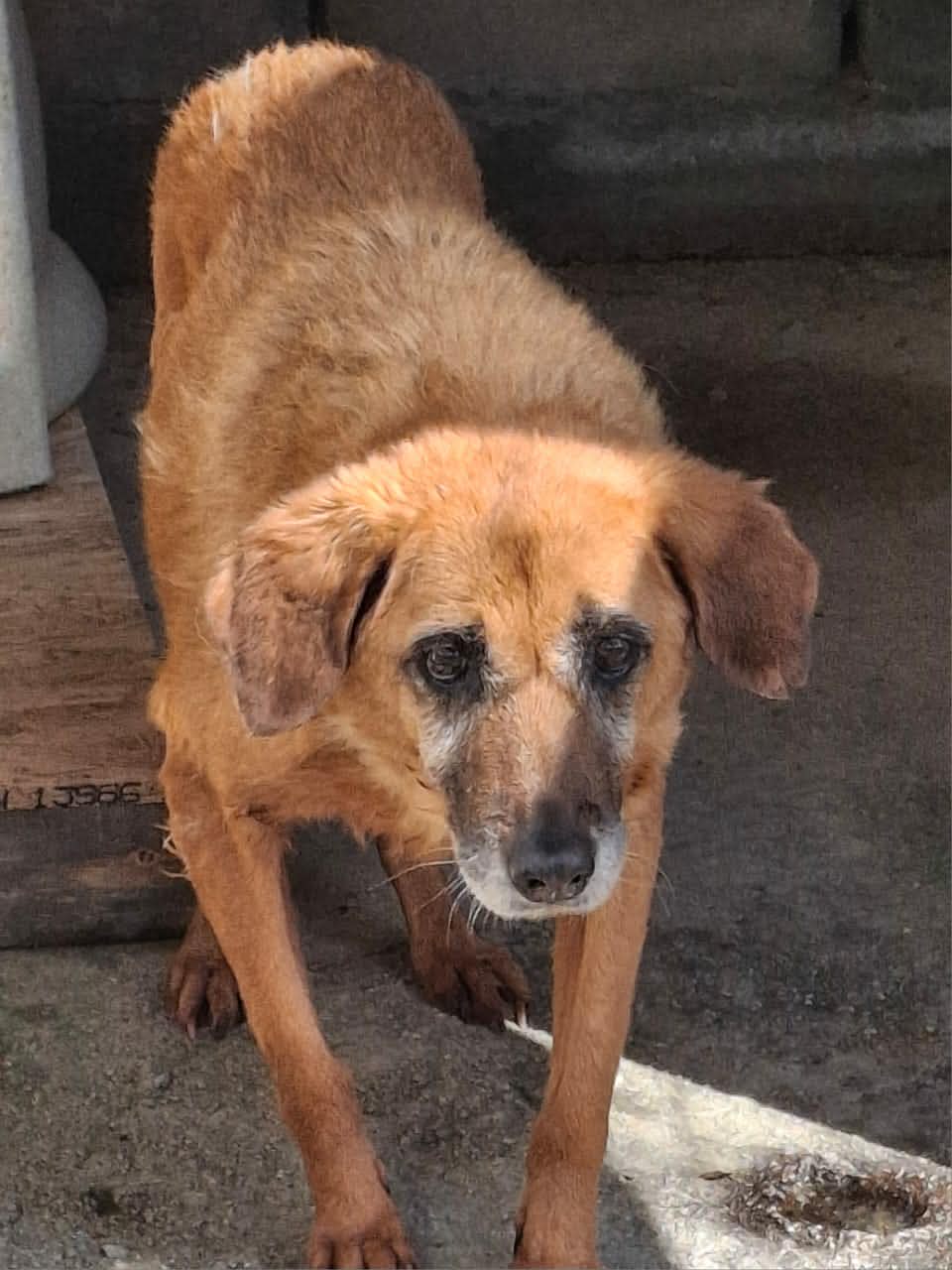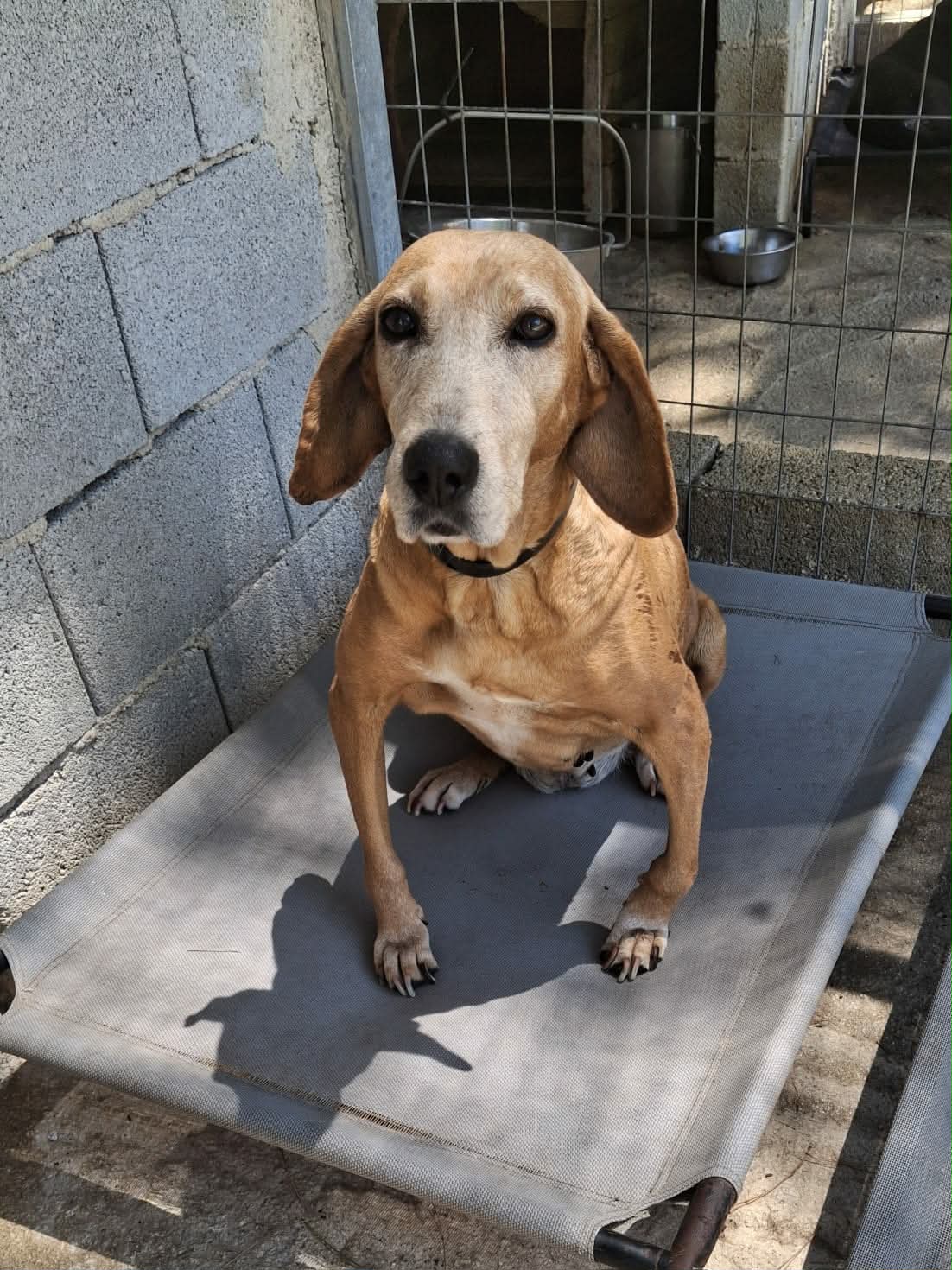 Kunnallinen koiratarha on ääriään myöten täynnä kodittomia koiria, että häkkipaikat loppuivat kesken ja sen vuoksi asustelen täällä koiratarhan piha-alueella odottamassa omaa aitaustani. Rauhallisena seniorina koen jatkuvan hälinän stressaavaksi ja kaipaisin hieman suojaisampaa lepopaikkaa.